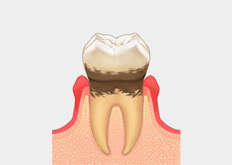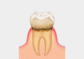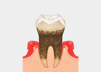 炎症が歯槽骨などの歯周組織にまで及んで溶け始め、歯周ポケットがより深くなったことで、歯の根本近くに歯石が沈着している状態です。歯を支える組織の破壊が進んでおり、早期に治療をしなければ抜歯になる可能性があります。自覚症状は、歯磨きをする時に血が出る、口臭がある、歯肉に痛みを感じるなどです。